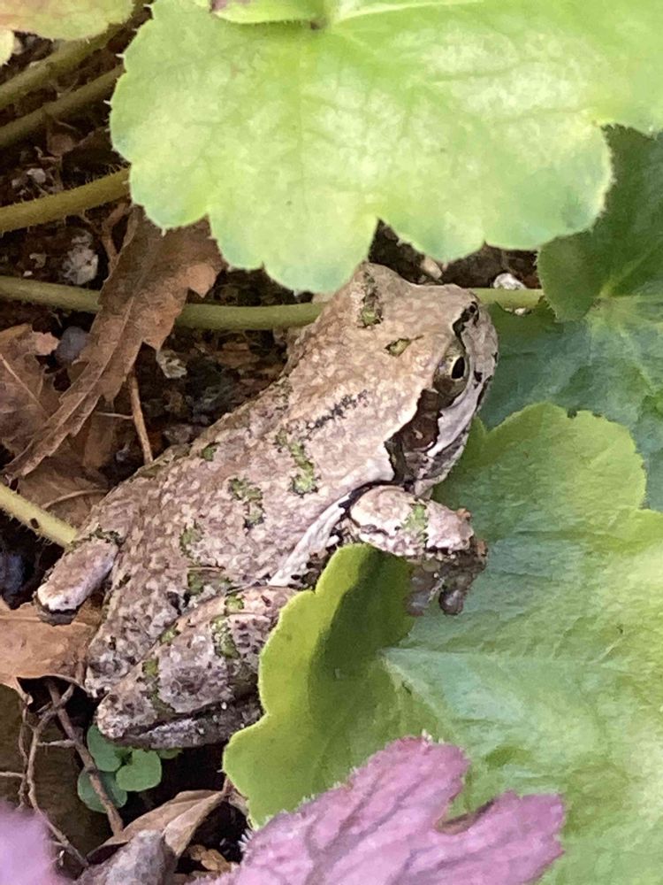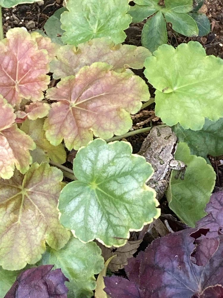 草取りしていて発見😲あっ❣️この子は先月寝ていた薔薇のベッドが散り落ち行方不明だった🐸大ちゃんではないでしょうか😍冬色になったわね〜