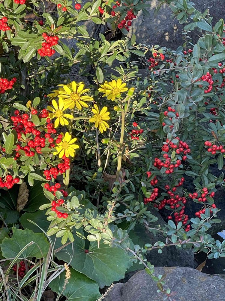 ピラカンサにモテモテのツワブキ🔴🔴🔴🔴🔴