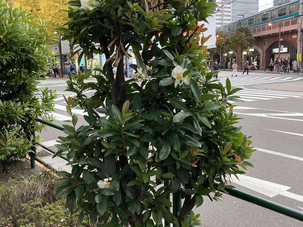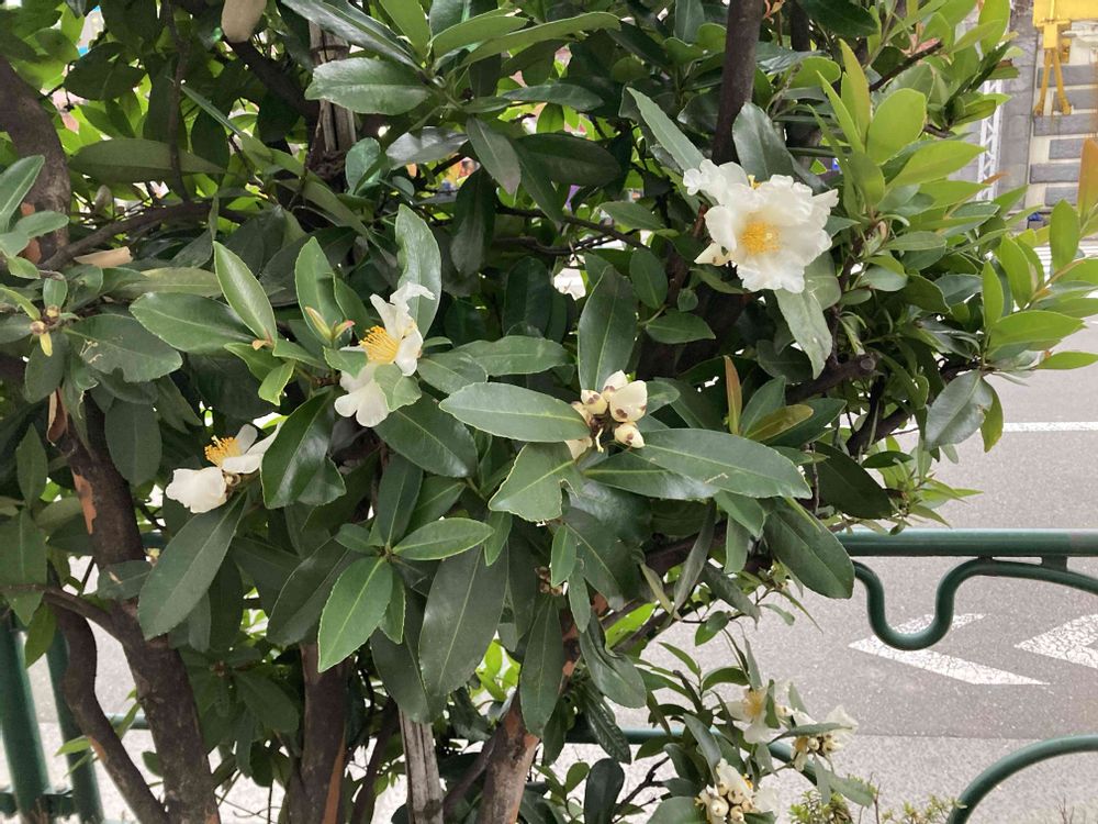 丸ビル前の都道402号線の舗道に植えてある「タイワンツバキ」が開花していた。
