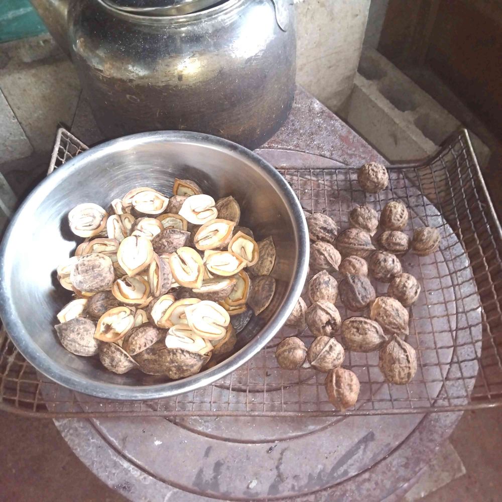 鬼胡桃、クルビをストーブで炙り割って実をほじくり出すのは子供の仕事😂😂👍