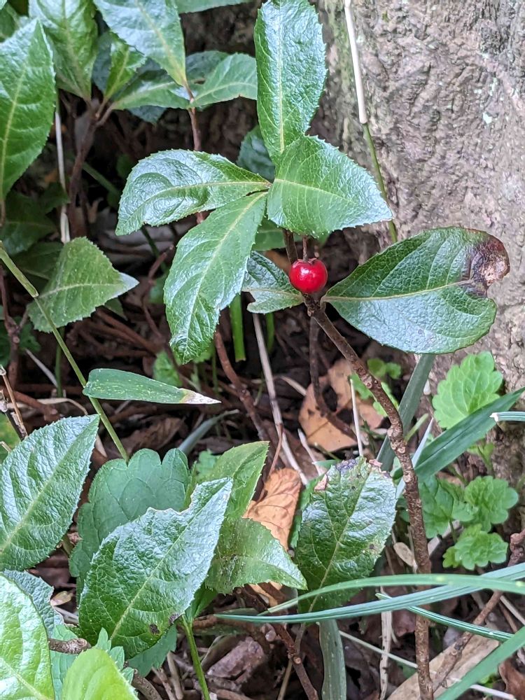 ひとつ実を付けたヤブコウジ