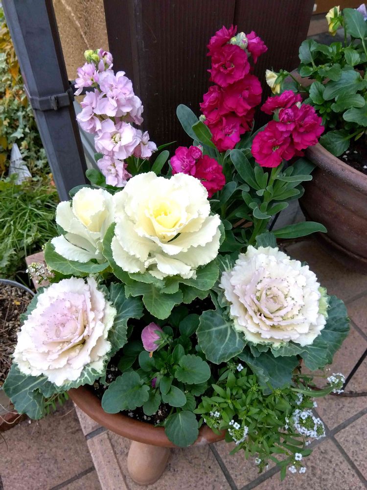 余った葉牡丹にストックやアリッサムやビオラわらくアプリコットを入れて寄植えにしました🤭