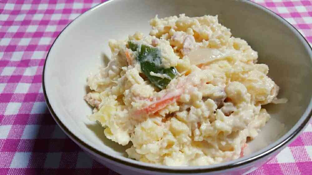 アンデスレッド、ニンジン、タマネギ、スナックエンドウ豆、カリカリベーコンをマヨネーズで和えてシンプルに。