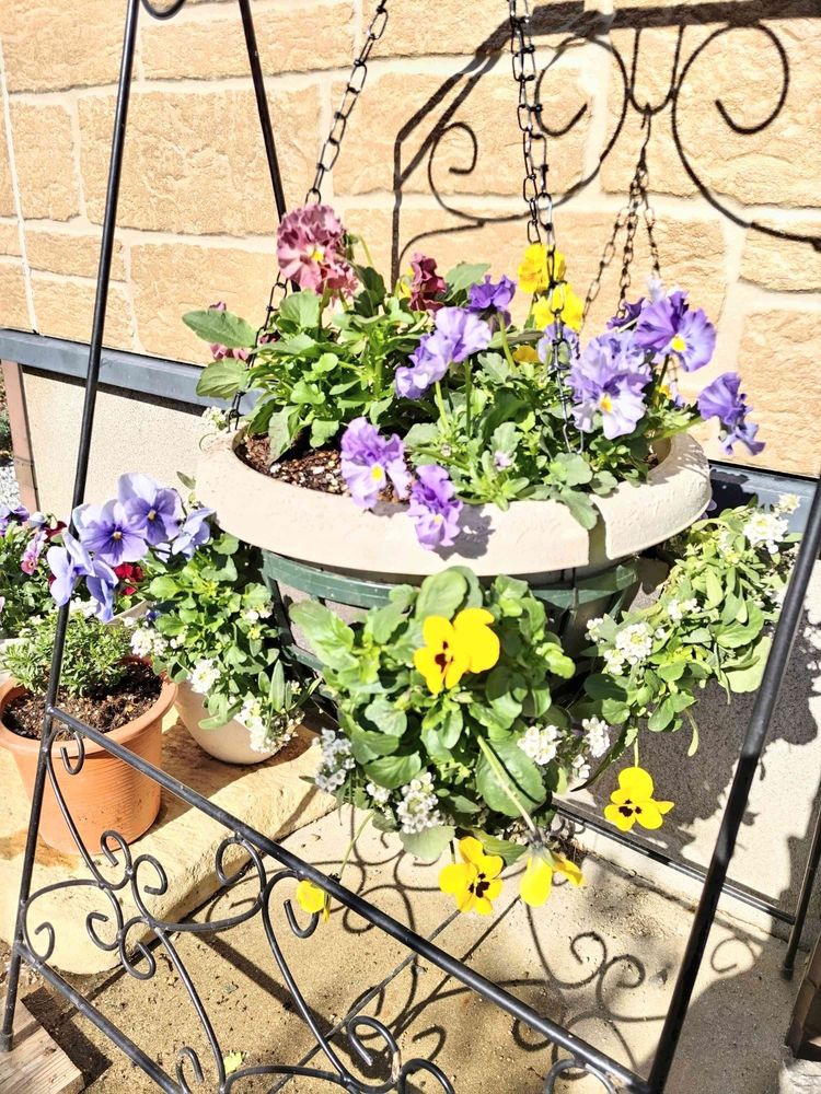 🌸この前の休日ハンギングバスケットにトライして見ようか?と思い付きやって見ました、オラのグローブの様な指の短い手じゃ植付けにかなり手間取りま したよ。上から目線の高さに吊るす予定なのでHSで買ったスリットポットでは上の植付けが厳しかったから割れたローズポットをカットして継ぎ足してみました、土止めのウレタンも多少加工した方が植付けがやり易い見たいだしね。此処んとこイチゴポットにビオラを植付けてたんで結構役に立つ事が有りましたよ。春にはハンギングバスケットが完成してる予定です。
