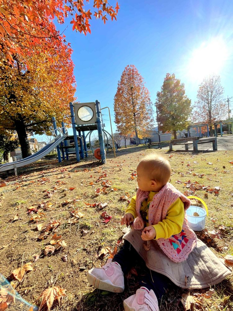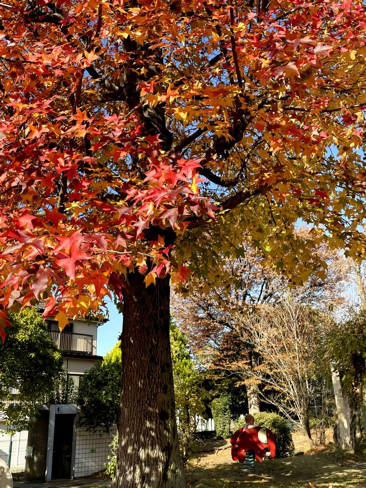 ベビとお散歩に行ったら、近所の公園のモミジバフウがとてもキレイに紅葉していました🍁