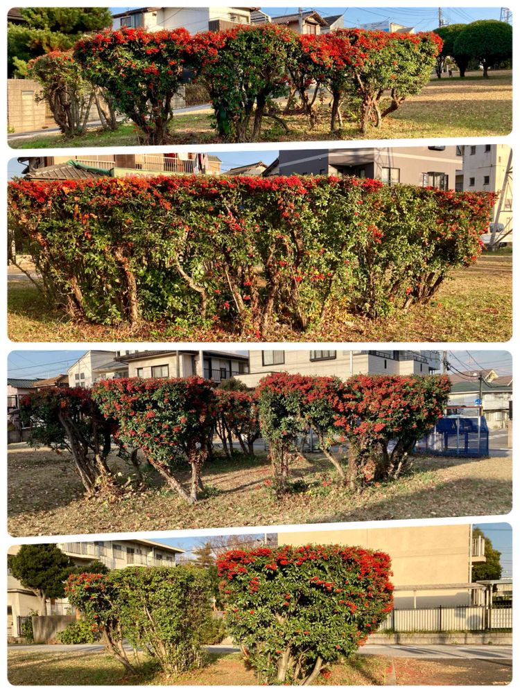 松戸市八ヶ崎のけやき通りにあるグリーンベルトには「ピラカンサ」が等間隔で植えられている。一昨日通ったら大胆に剪定されていた。