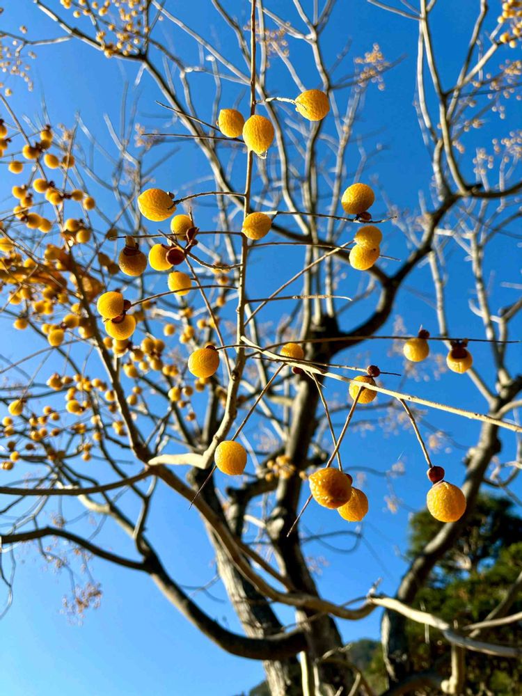黄葉した葉が落ち果実が蒼空に耀いてます。