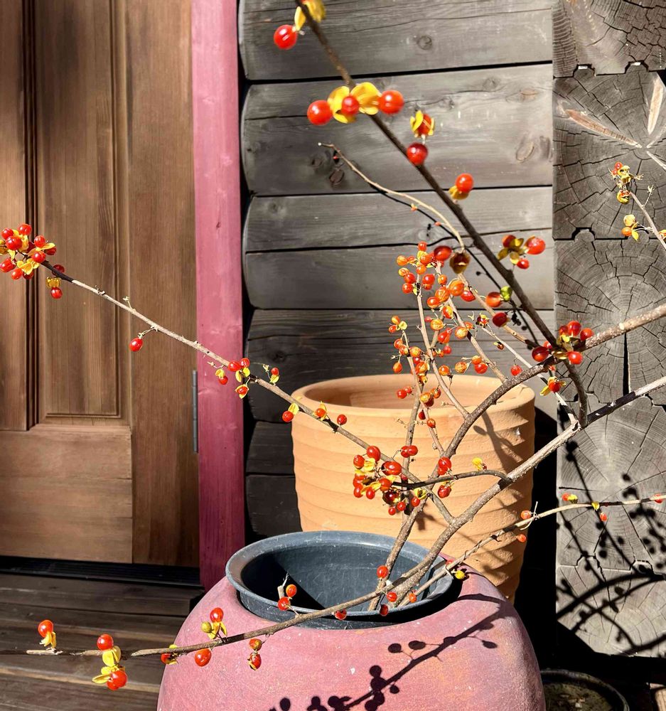 玄関先の大きな鉢にナチュラルに投げ入れられたツルウメモドキステキですネ💓