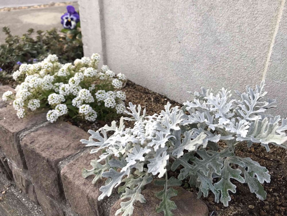 玄関に植えたアリッサムとシロタエギク。アリッサムは風に負けずとても元気❣️奥に見えるお猿さんの顔みたいなパンジー🐵