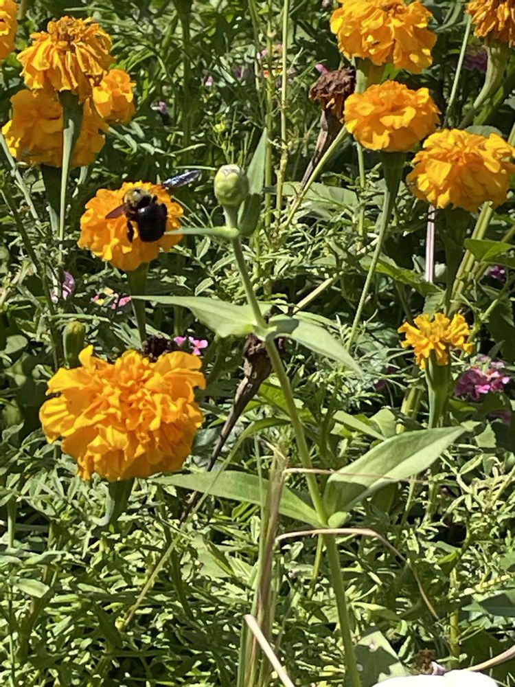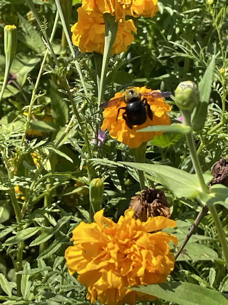 おはようございます。蜂かな?🐝マリーゴールドは眼に良いんです~