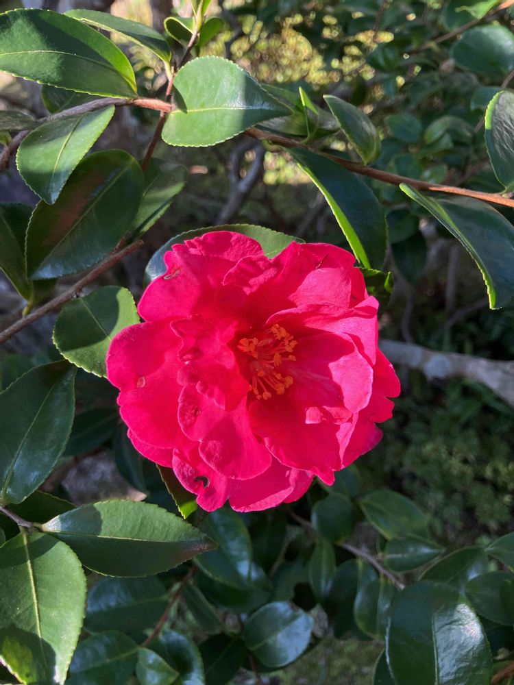 🌝我が庭のサザンカです。あまり花をつけないよと庭師さんに言うと、手入れをすると花が付かないとのこと。たくさんの花がつくことを取るか、手入れをしてスッキリした樹の姿を取るか、それが問題です。