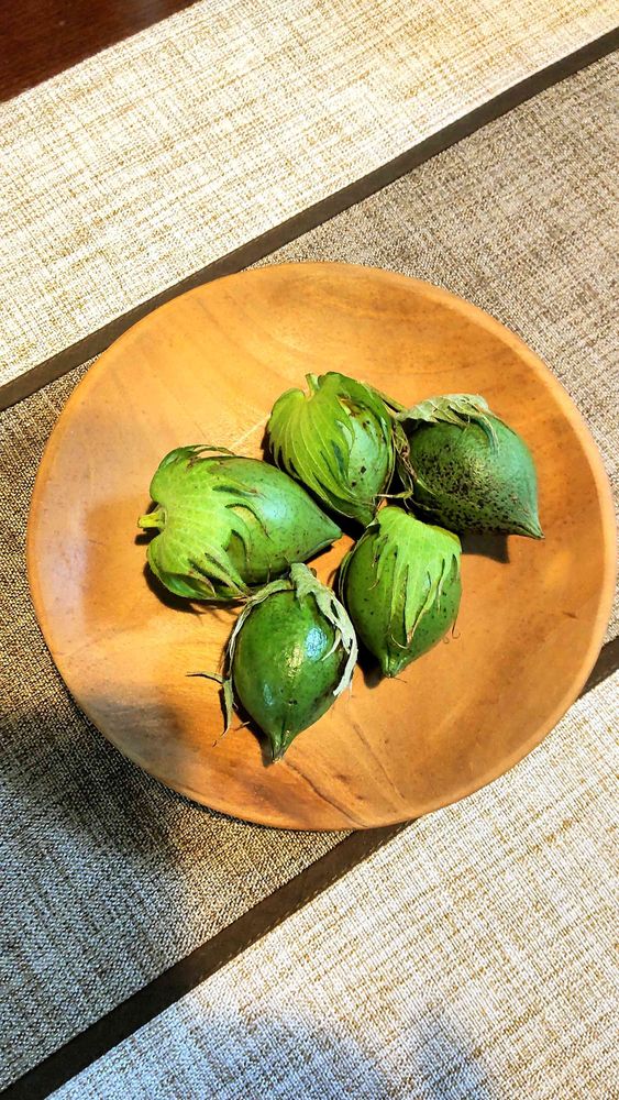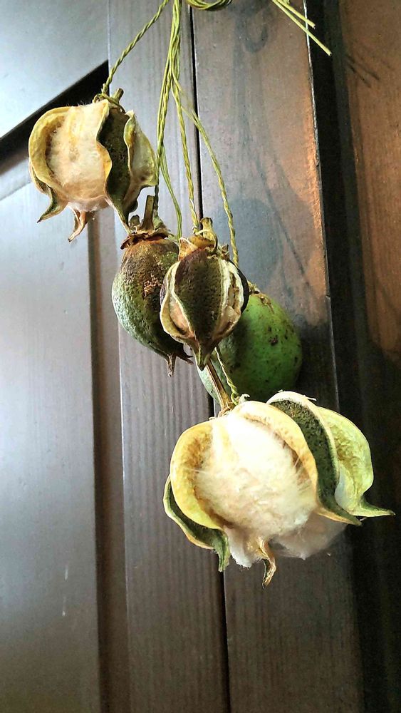 青い綿の実を吊るしておいたら、弾けて綿が出てきました😊✨