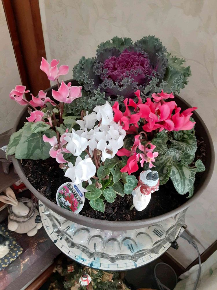 葉牡丹やシクラメンを買って来て寄せ植えしました。
