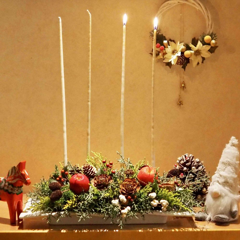 クリスマスアドベントキャンドル🕯️2本目点火ですね〜🍎が加わってまた違った雰囲気に👍アドベントキャンドルやってみたいなぁ😆💗