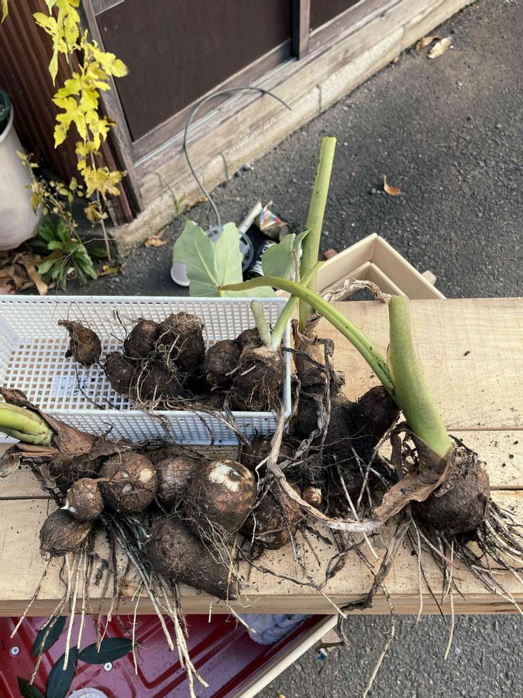 去年の12月に「インカ」とか「メソポタミア」とかジョークをかまして投稿しましたあの大きな親芋2個を含めて全部で7株になっていたんですが収穫はこれで全部です😓