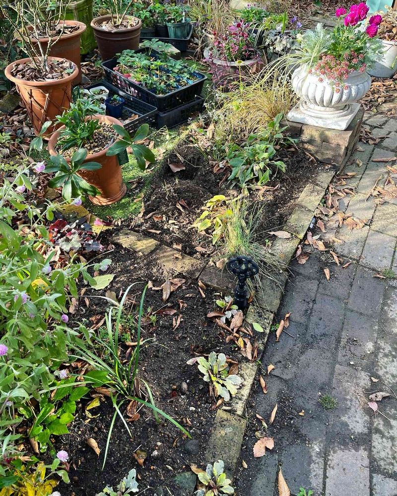 ❷まだまだ咲かない自家採取種まきっ子ちゃんたち。どんなお顔の子が咲くのか分からぬまま、セロシアを抜いてスッキリした花壇(❸)に植え込みました。チューリップもよーやく植え込んだ!
