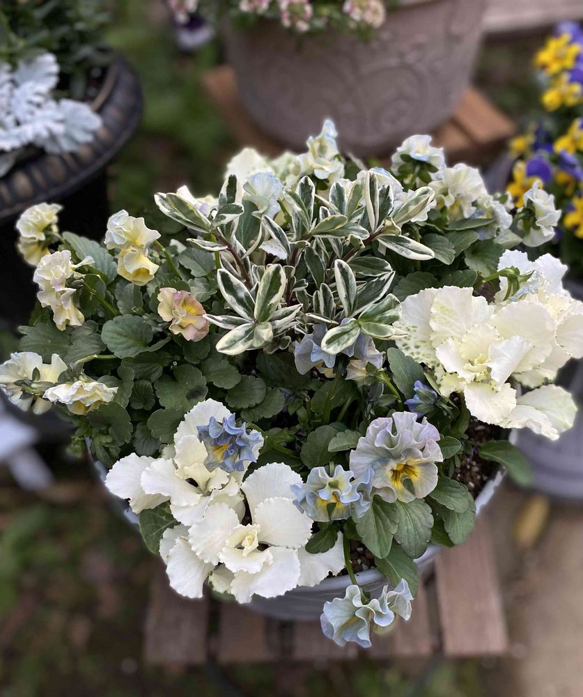 フリルビオラとハボタンでオフホワイトな寄せ植えにしてみました🤗✨✨