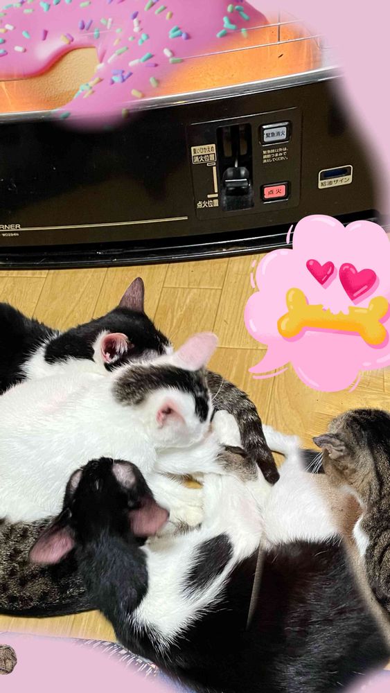 冬の風物詩ストーブの前の猫団子