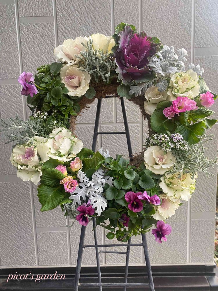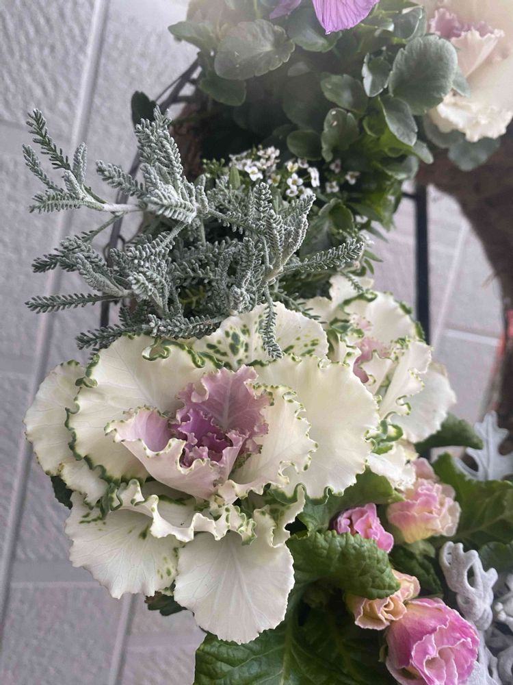 白い葉牡丹にピンクのお花が素敵なリースハンギングが出来ましたね🤗💕💕