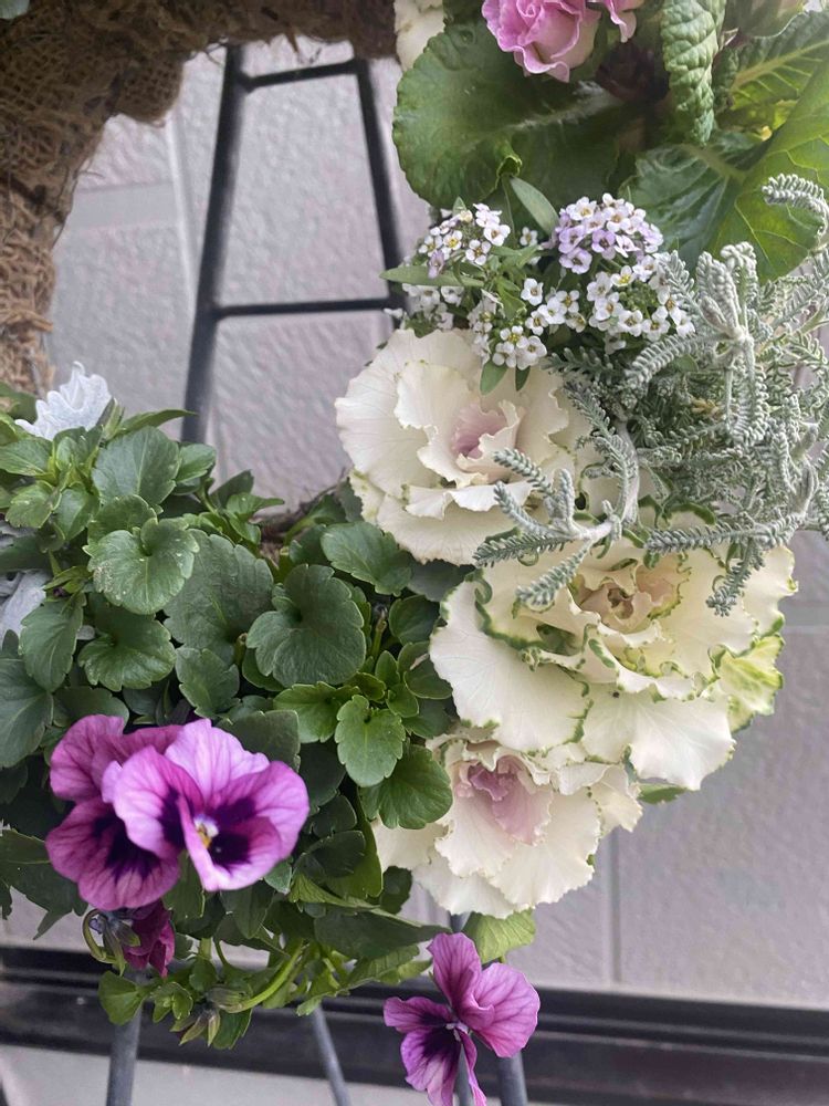 5個の白のミニ葉牡丹を2個と3個に分けて入れました。均等に入っていませんが😅 何とか冬のリースハンギングが出来ました❣️