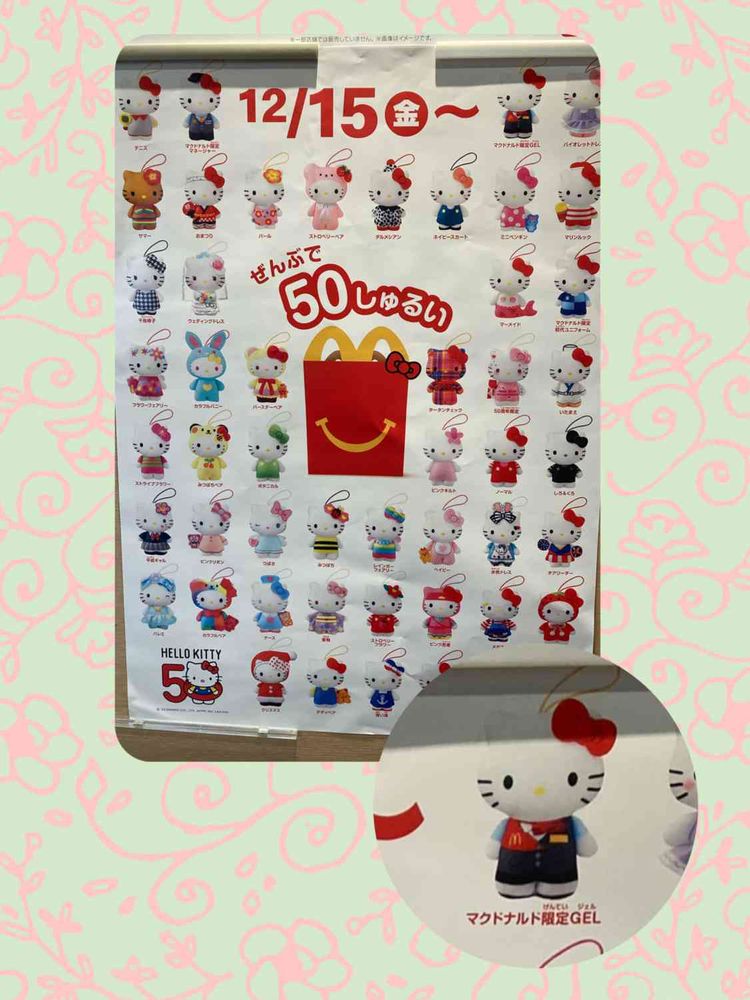 今週15日にマック🍟🍔🥤がキティちゃんとコラボしてハッピーセットに50しゅるいのキティちゃんたち❣️