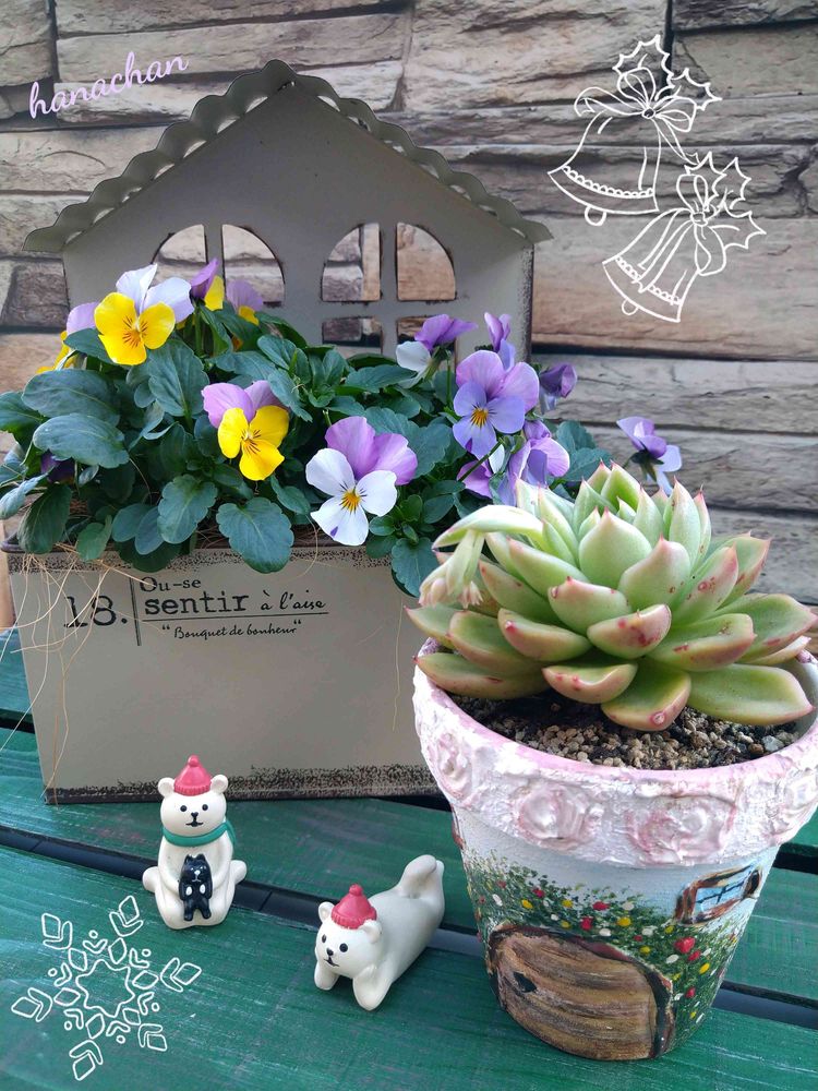 この時期のオブジェとコラボの多肉やパンジー🌼ステキですね💓