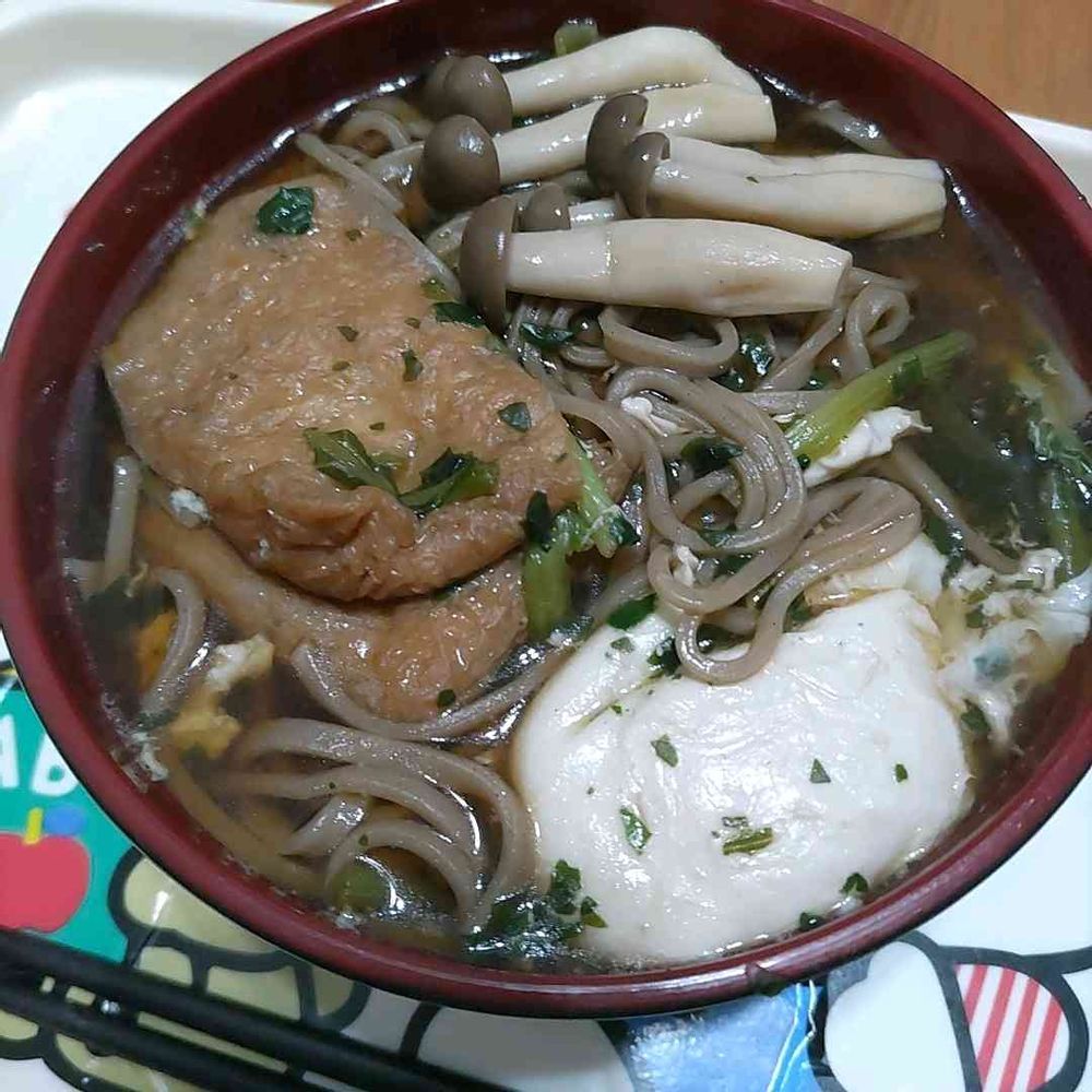 冷凍庫に安い時に買って冷凍してあった味付け油揚げ、小松菜、しめじと半熟卵を入れてお蕎麦を食べました😋