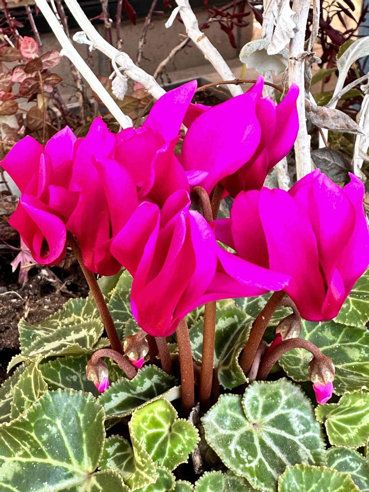 ①久々にお花をを買って去年の寄せ植えの空いている所にガーデンシクラメンを。(植え替えずに入れただけだからどうなるか💦)