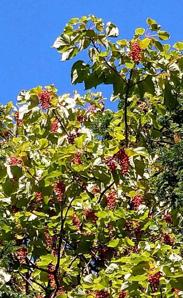 10m位ある高い木の上に赤いイイギリ(飯桐)の実が沢山〜実っていました。