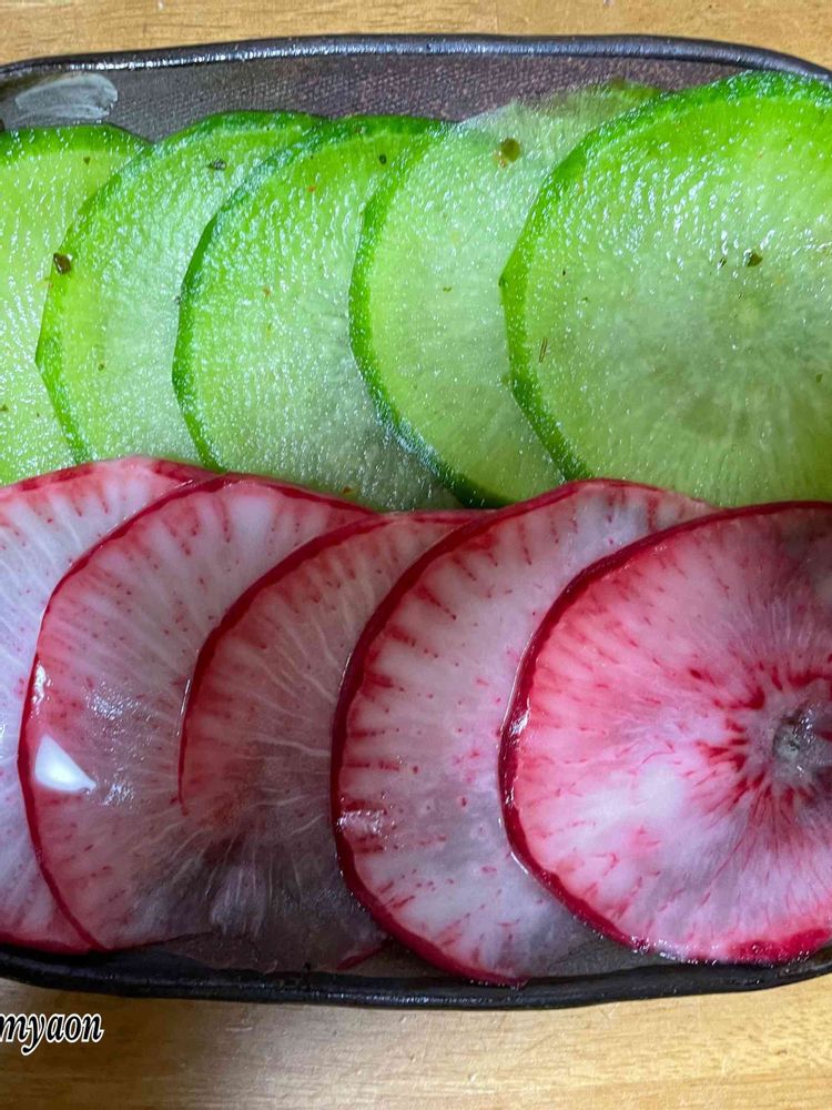 4、5枚目 先日、JAで購入した赤かぶ&みどりさんが育てた“みどり大根”カットした断面と甘酢に漬けた赤かぶ&鯛塩に漬けたみどり大根。どちらも美味しかったŧ‹"( ˙༥˙ )ŧ‹"
