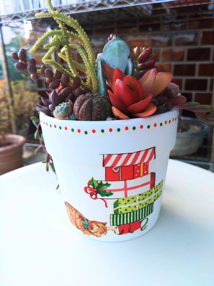 だいぶ前にデコパージュした植木鉢【一応クリスマス柄】に