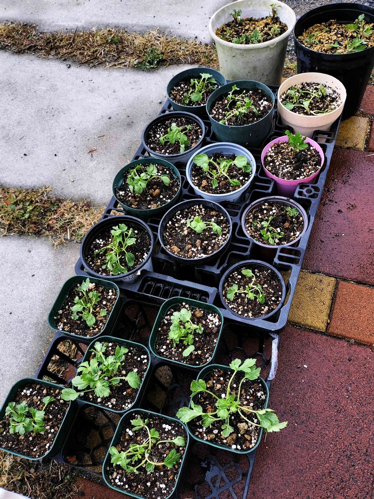 一昨年の球根から鉢ごとガレージで保管していたものを育てたラナンキュラス達、去年は葉はモリモリなのに全然咲かず。今年も鉢ごとガレージ保管→先月頃から水やりしてたら既にモリモリ…これって混み合いすぎてて咲かないのでは?と思い立ち、球根1~2球に分けて植え替えたところ、1鉢からこれだけの量に分かれました…疲れましたがそりゃ咲かんなw