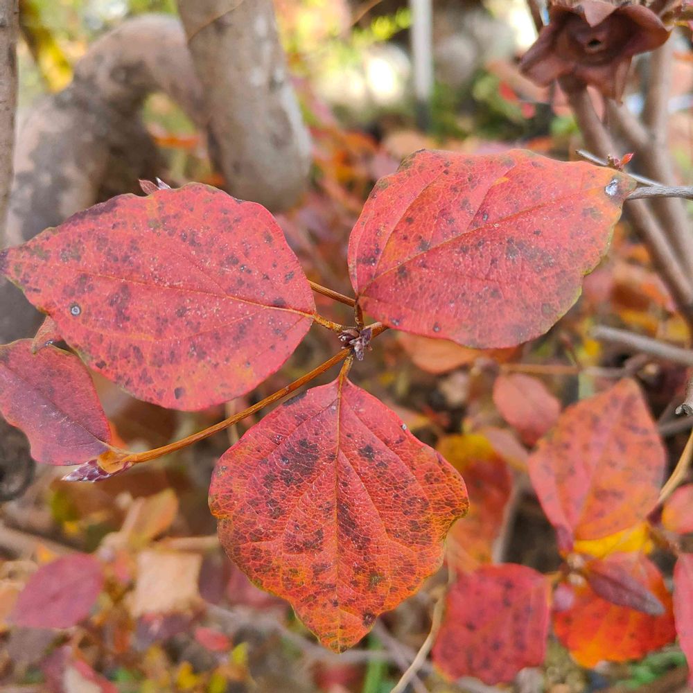 柿の木の葉が紅葉して落ちミツバツツジが紅葉してそろそろ 花壇にして棚には鉢を置き灌水してるからか紅葉は遅れたのかも花壇に合うように姿を変えるのも大変