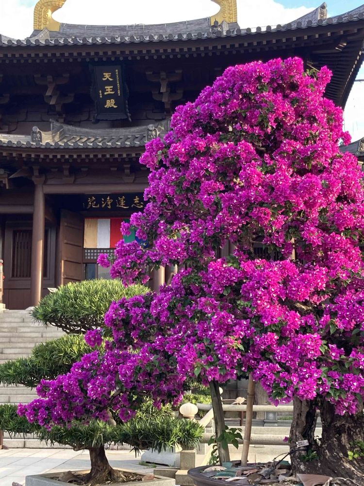 ブーゲンビリア🌺香港、志蓮淨苑、本堂の手前にて。睡蓮の池とも調和して盆栽、素晴らしいです👍😃🎶