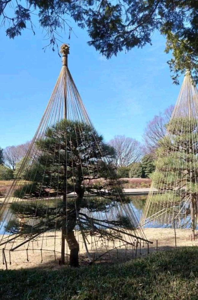 池の側の雪吊りされたクロマツが青空に映えて素敵です💚🌿