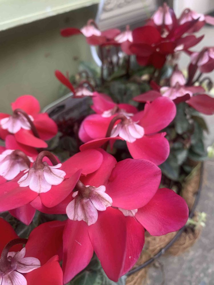 シクラメンのつぼみがたくさんで嬉しいです。少し淡い赤と濃いめの赤の2色が鮮やかな花で玄関を彩ってくれています。