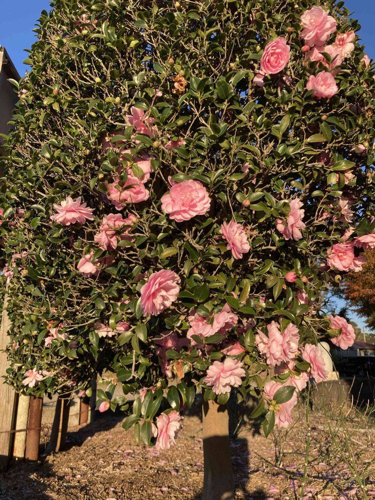 見事に咲き誇った山茶花が、朝日を浴びて、気持ち良さげに大きく欠伸をしているようです。