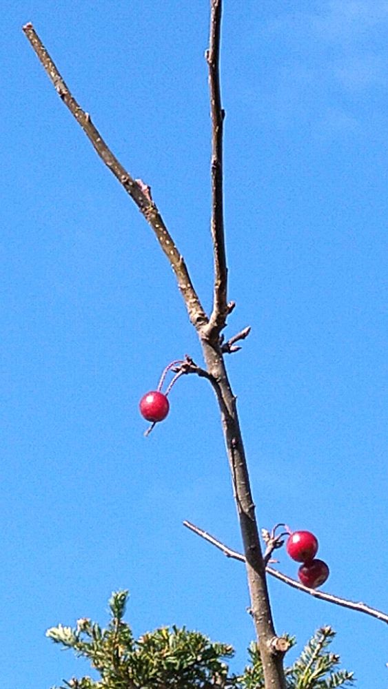 わずかに残ったヒメリンゴの実が、小さいながらも、青空に輝いています。