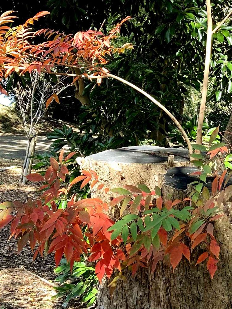 バッサリ切られた公園の木‼️2枚です。"まだ元気で生きてるよ❣️"と言わんばかりに小さな枝が伸びて葉っぱ🌿が紅葉🧡してはるわ〜💖凄い生命力に拍手👏頑張れ〜😤