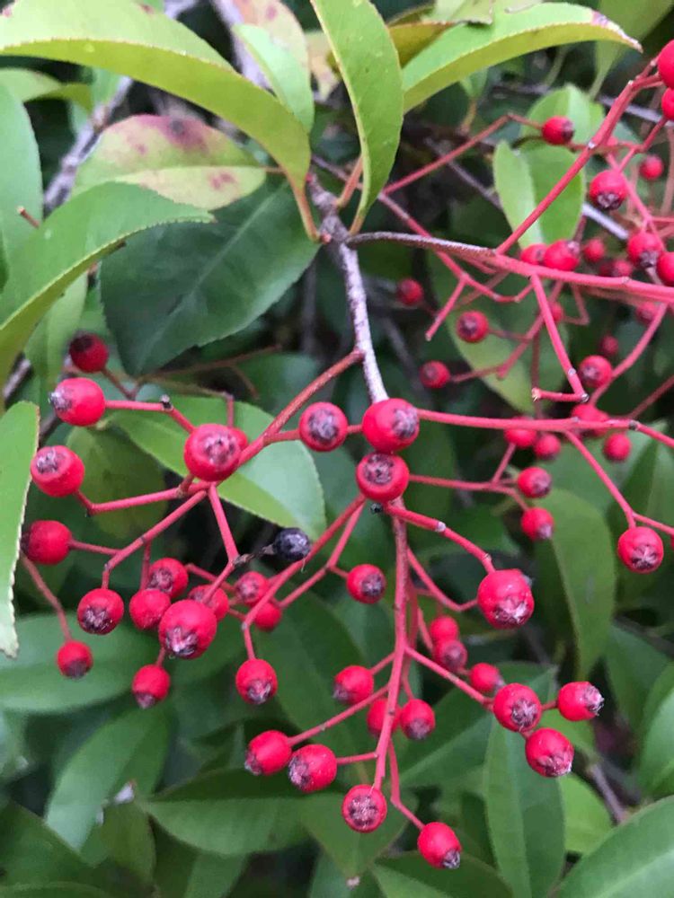 家の前のテニスコートの脇で、今年もカナメモチの実が赤くなって、綺麗です。