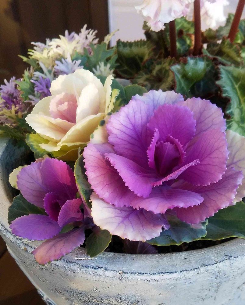 今年お迎えした葉牡丹…小さな子ばかりですが、いつも脇役の葉牡丹を今日はメインで✨💜🌿