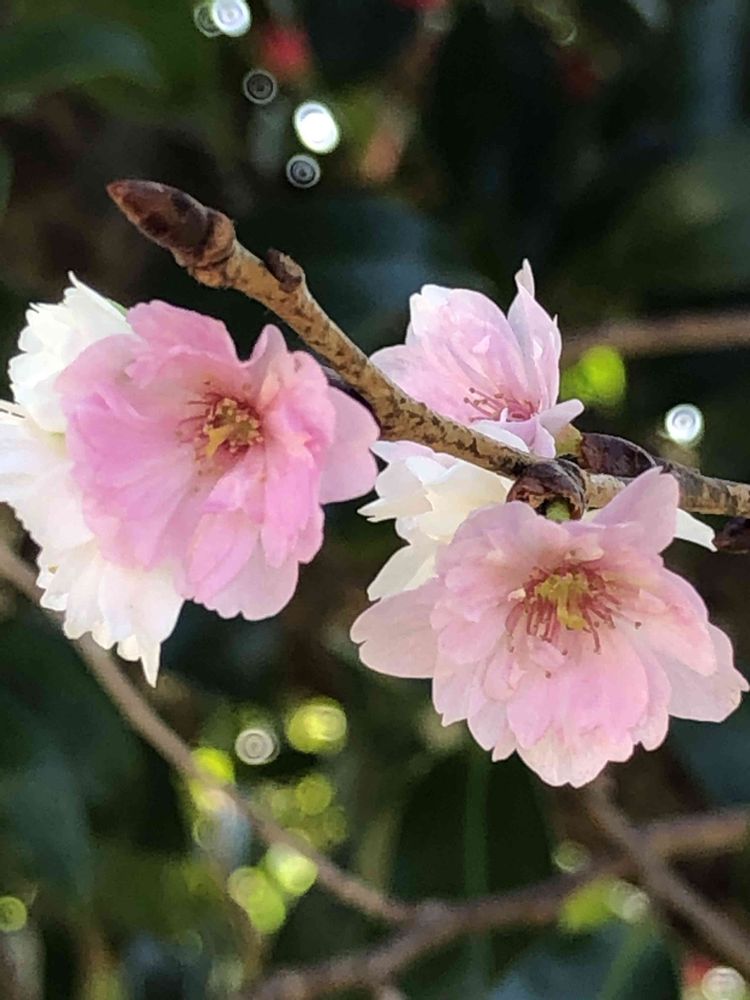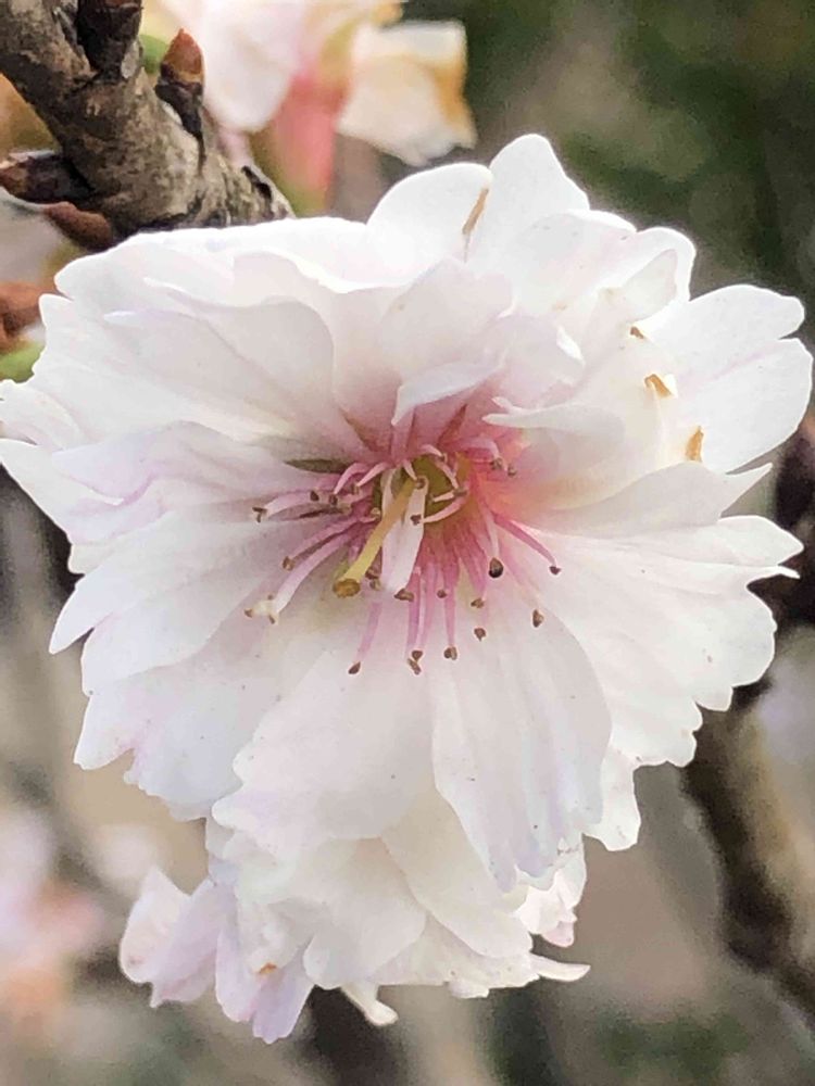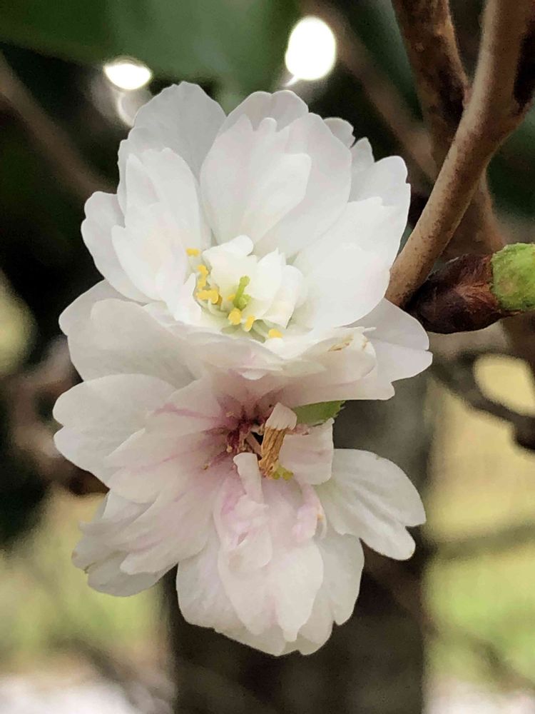 八重の透明感のある花びらで白とピンクが同じ木に咲いています。