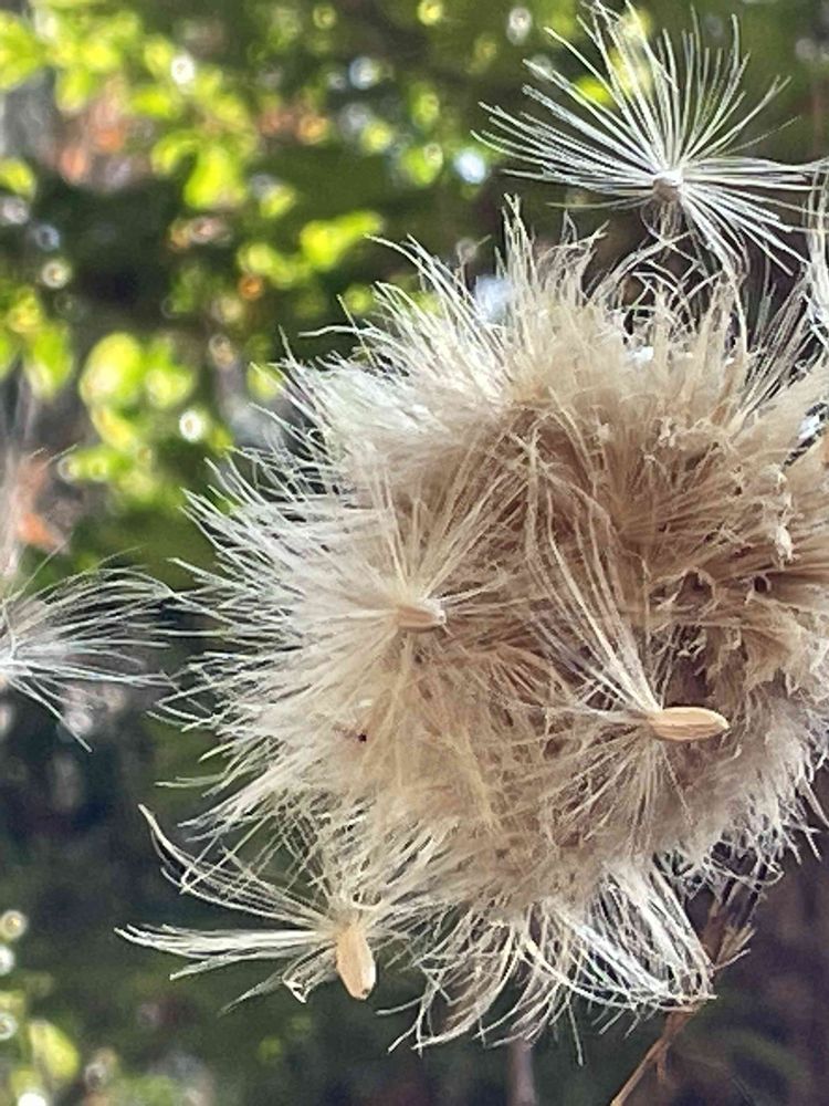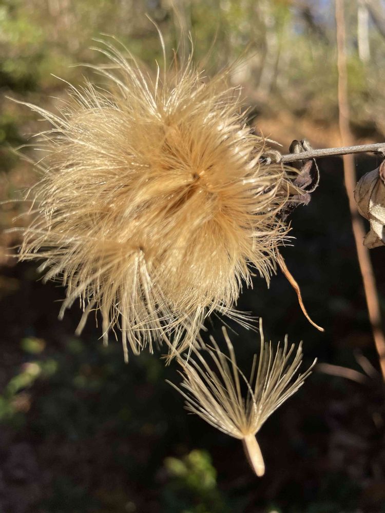 綿毛の塊、陽が当たると黄金色に輝きます🏷木曜モフモフ参加させて下さい。風が吹いてくるのを待っています。強風が吹いてこないと遠くまで飛べないね