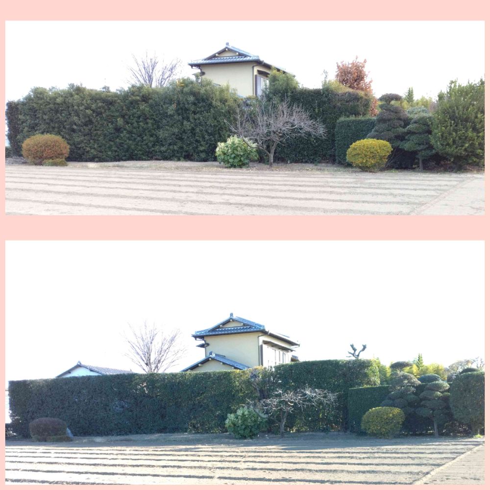 🌲2枚め:家の西側から見たクネ(防風林)です。上が剪定前、下が剪定後。中央が少し凹んでいるのは、樹勢が衰えていて新しい枝葉が伸びない所です。