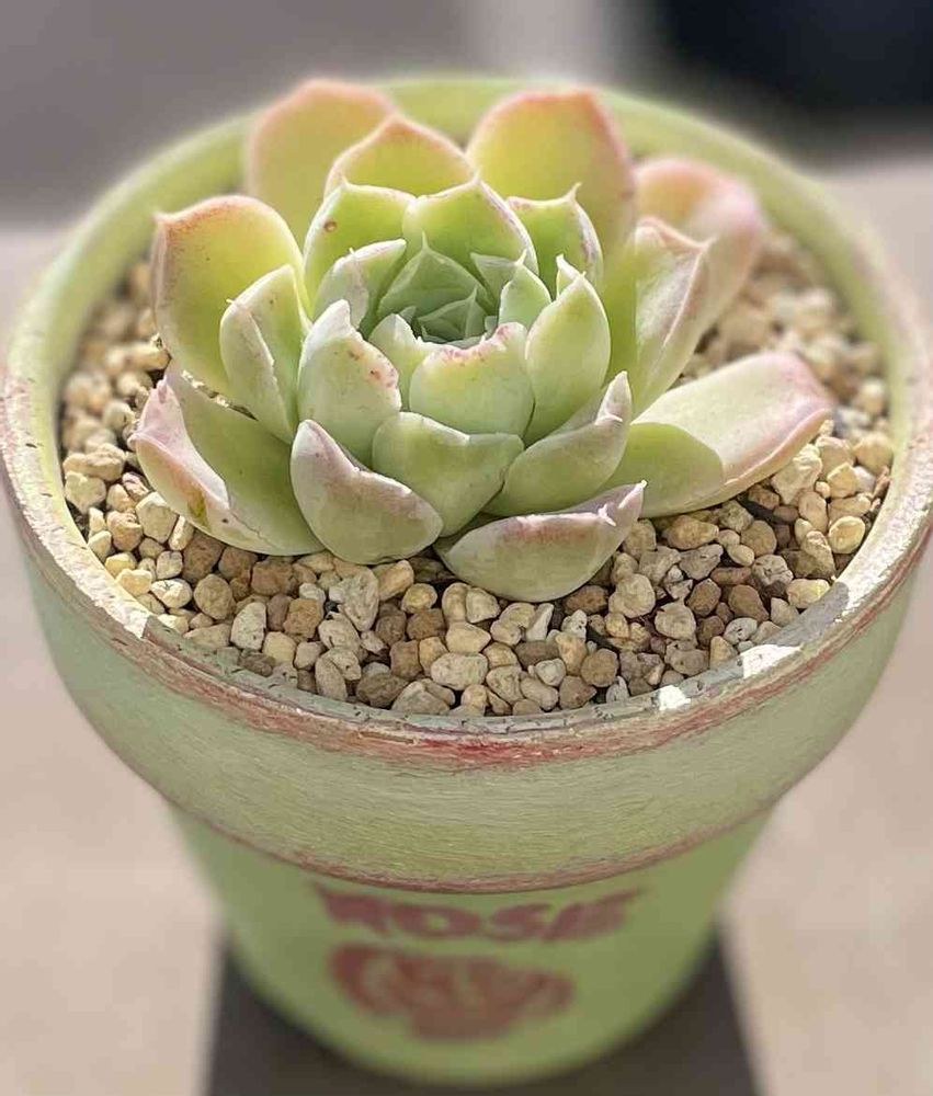 若草色の鉢とお揃いのバラ月齢さん