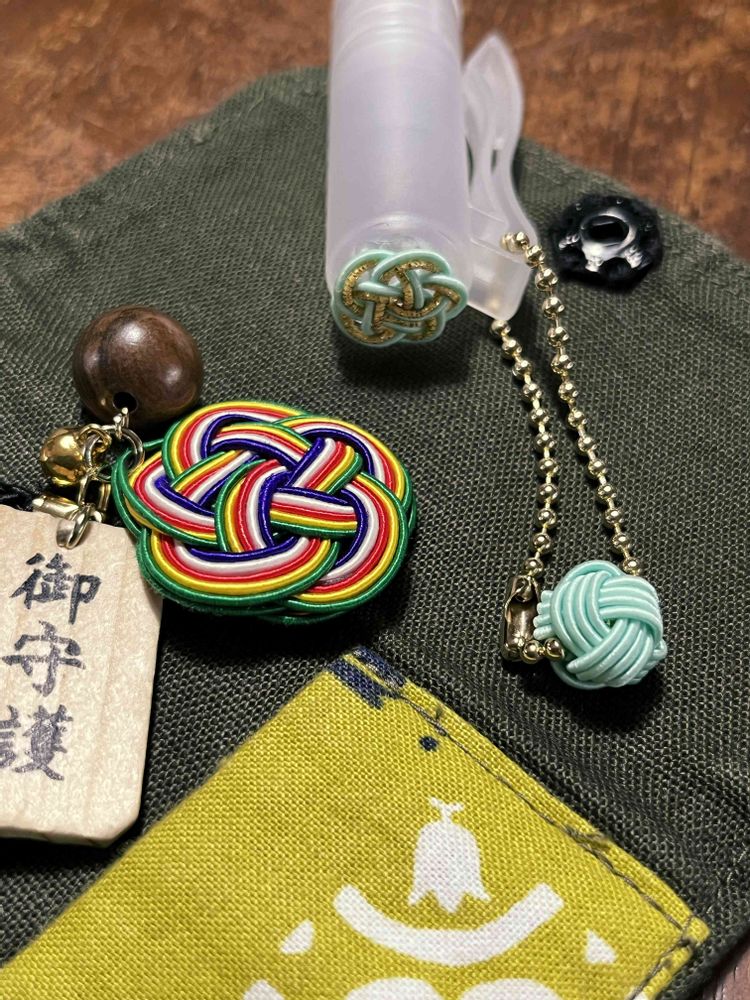 お守りの水引き細工とスプレーボトルの飾りもお手製です