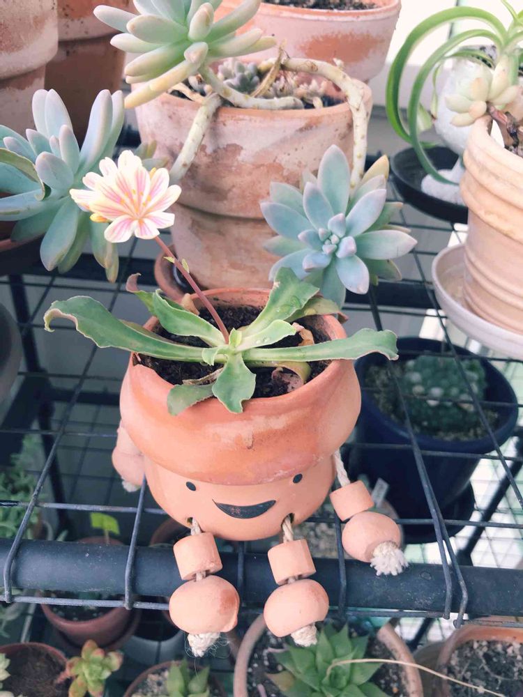 旦那に買ってもらった鉢に植え替えたレウィシアの子株に花が咲きました。