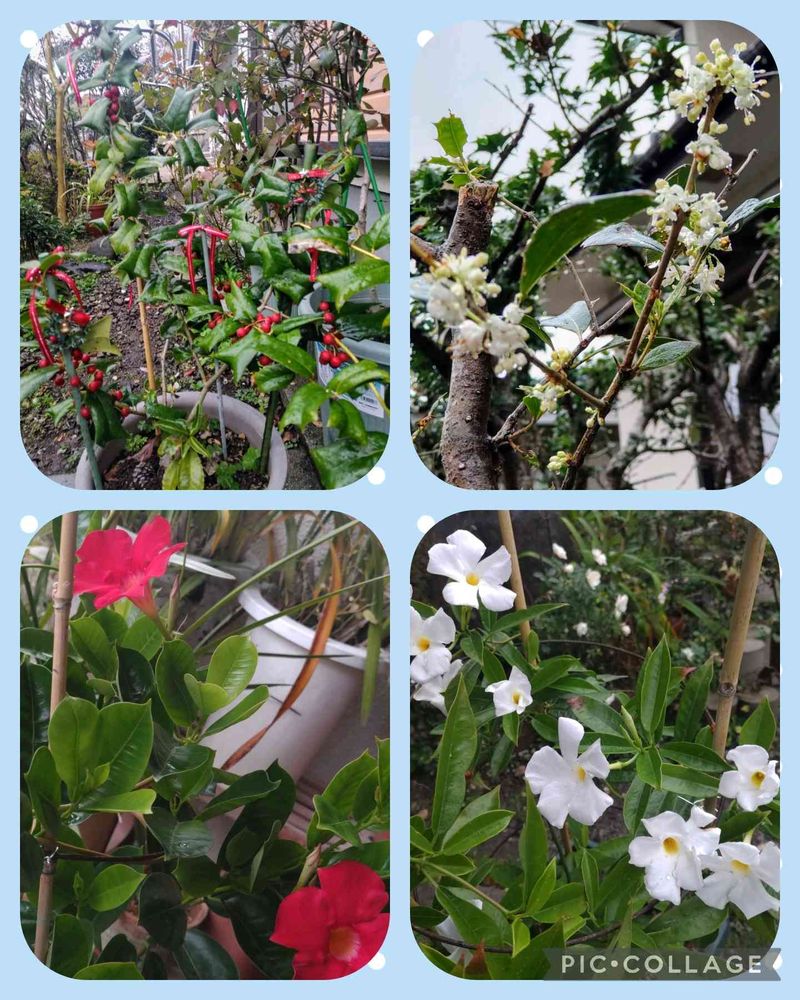 午前中は晴れ☀午後から冷たい小雨☔が降ってます。バッサリ選定された柊が小さな葉っぱ可愛い🤍花を付けて雨☔に濡れながらも、花びらパッと開いてます❇️寒くなったのに、サンパラソルの赤❤️🤍