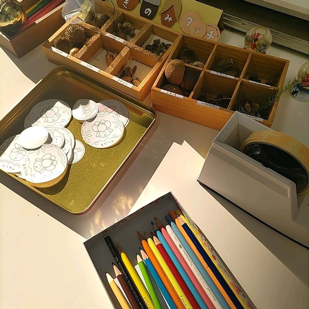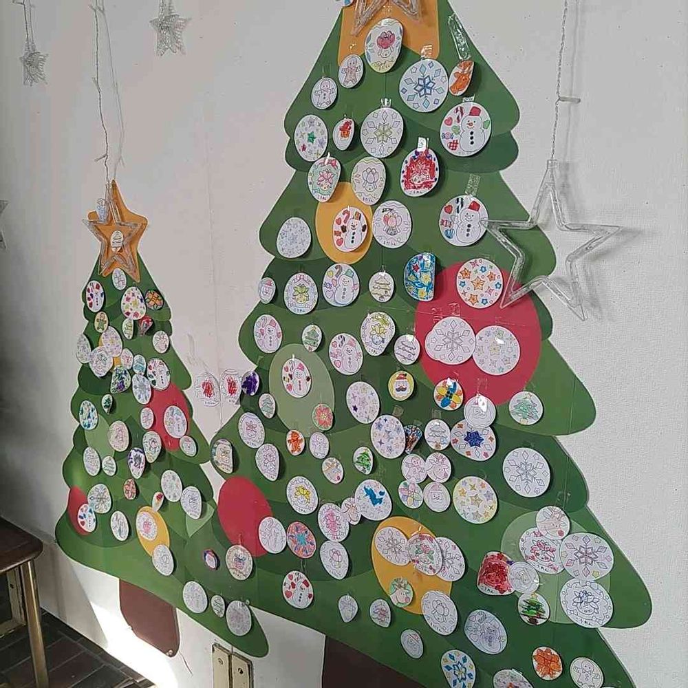 子供たちのぬりえを貼ってクリスマスツリーが出来てました🎄