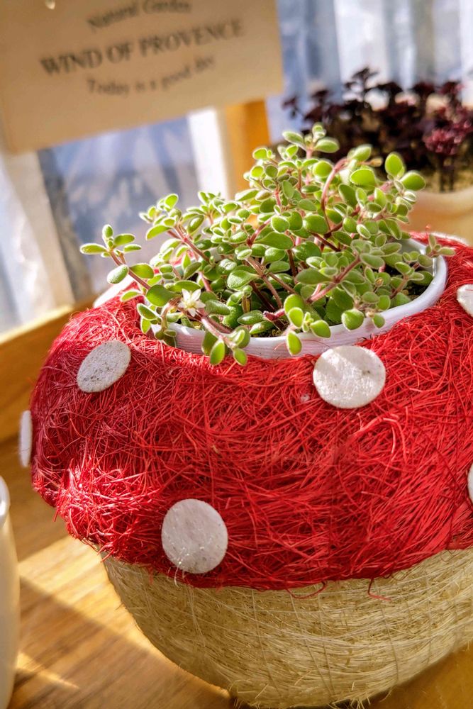 ②🍄カバー、穴開けして植えようか?と1年以上~🍀入れてみた。寄せ植えどうかなと考え中🙄あっお花咲いてる👀
